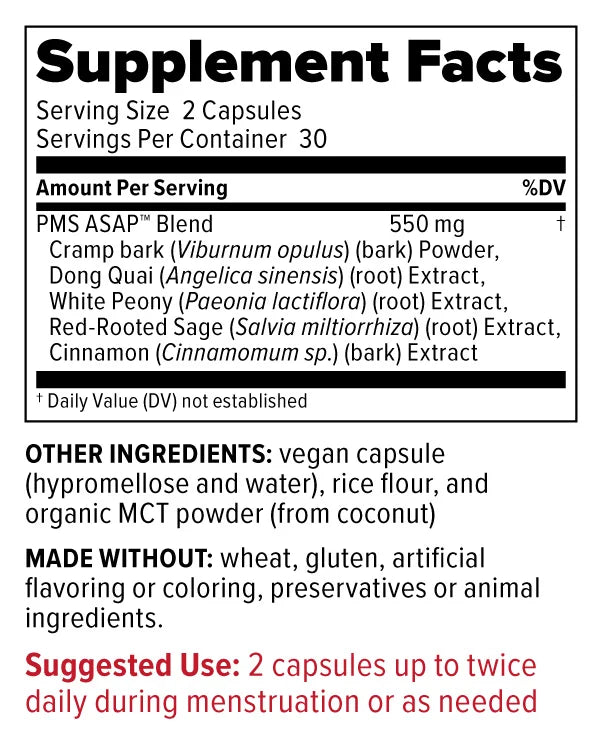 PMS ASAP™ is formulated with herbal ingredients like Cramp Bark and Dong Quai to provide quick relief from cramps and other period-related symptoms.